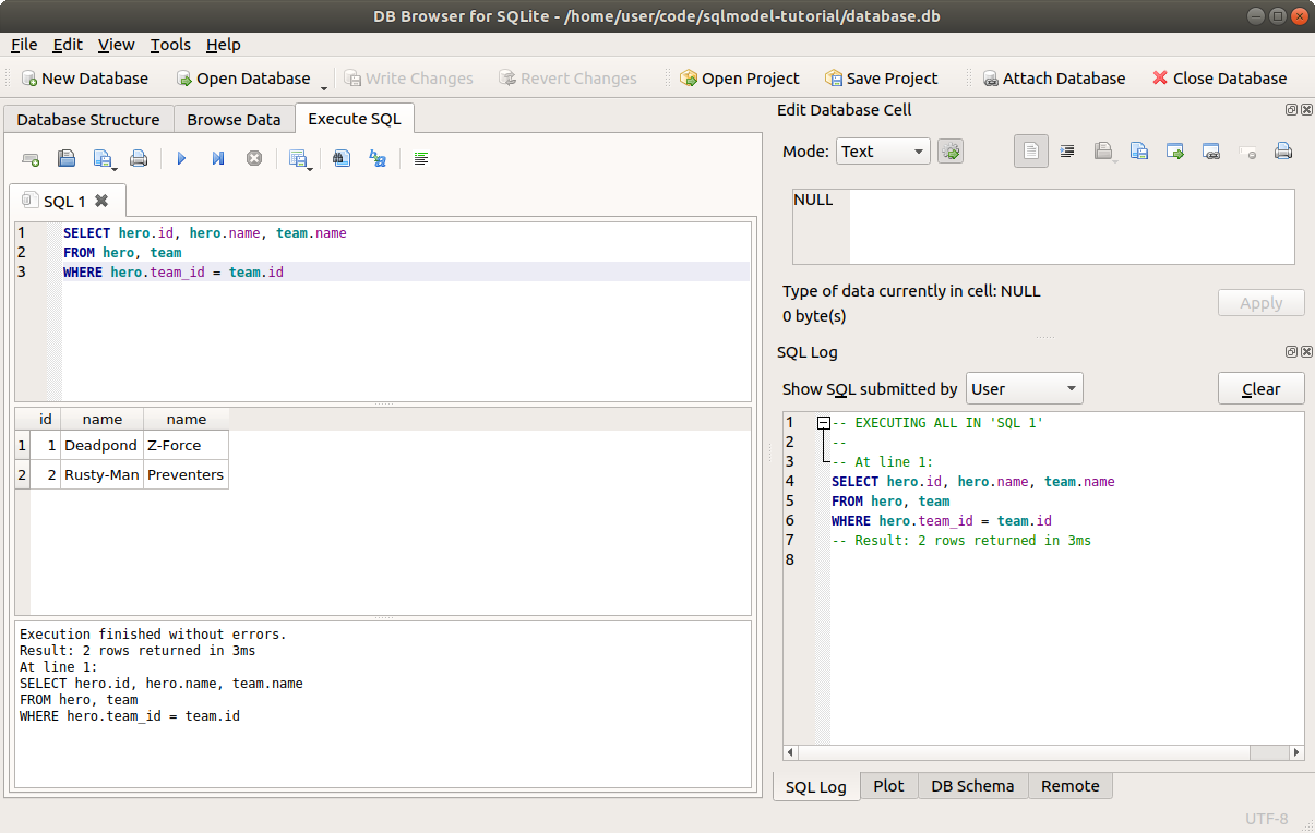 By putting the Team in select() we tell SQLModel and the database that we want the team data too.